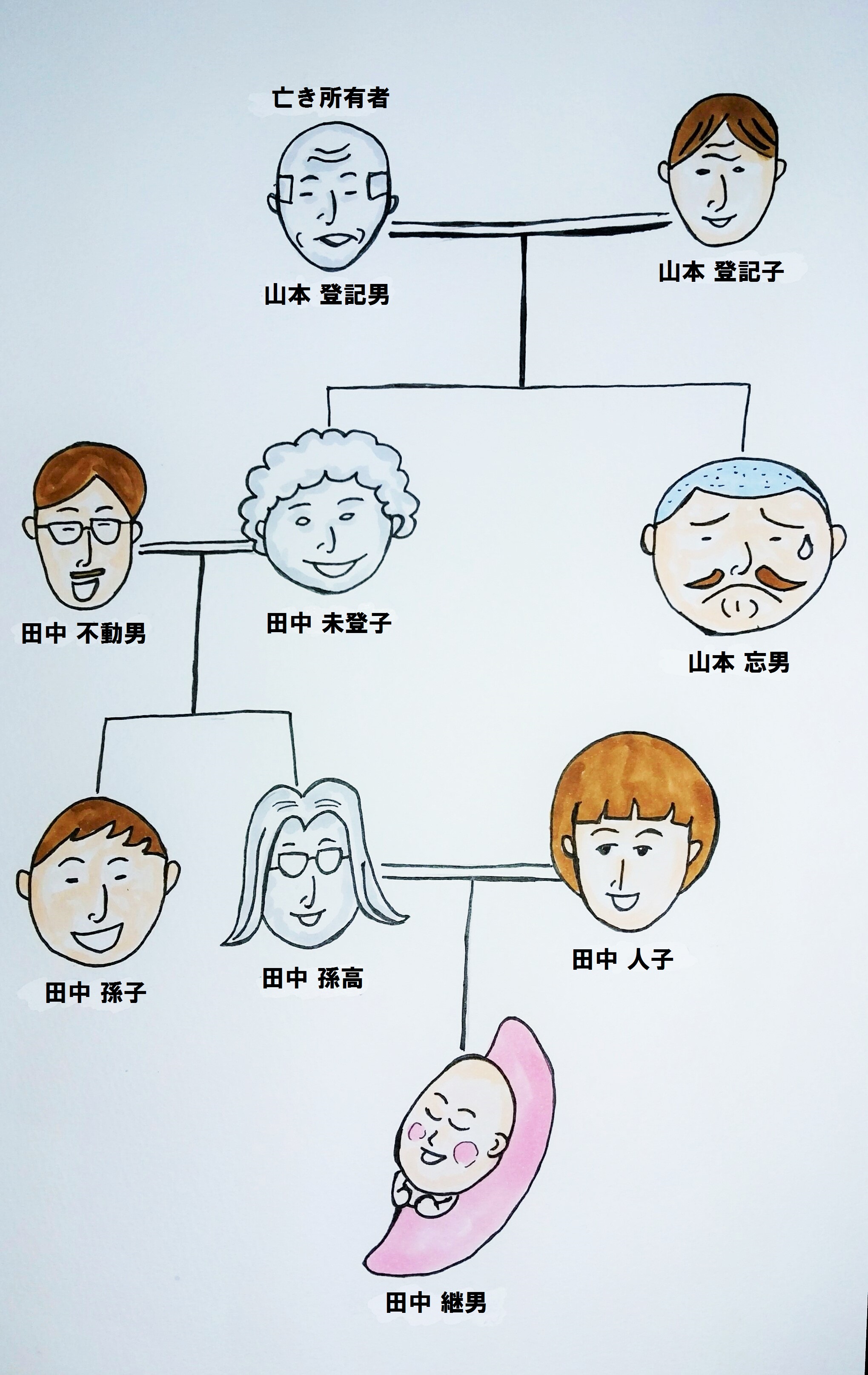 3.その間、山本登記男の娘である相続人田中未登子が亡くなり、続いて田中未登子の相続人である田中孫高も亡くなっております。